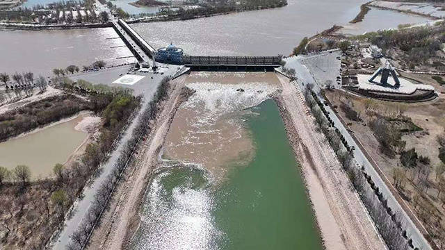 在黄河三盛公水利枢纽工程,黄河水一路奔腾涌进总干渠,今年春夏灌干渠放口时间较上年提前3天。